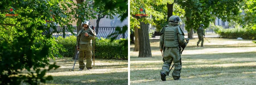 Специально для устранения такого подлого и нечеловеческого поступка в Донецк прибыли российские военные инженеры из состава Международного противоминного центра. Саперы проверяют улицы, парки, скверы и дворы Донецка. Им помогает робототехнический комплекс разминирования «Уран-6». Работу российских инженеров запечатлел корреспондент «Военной платформы».